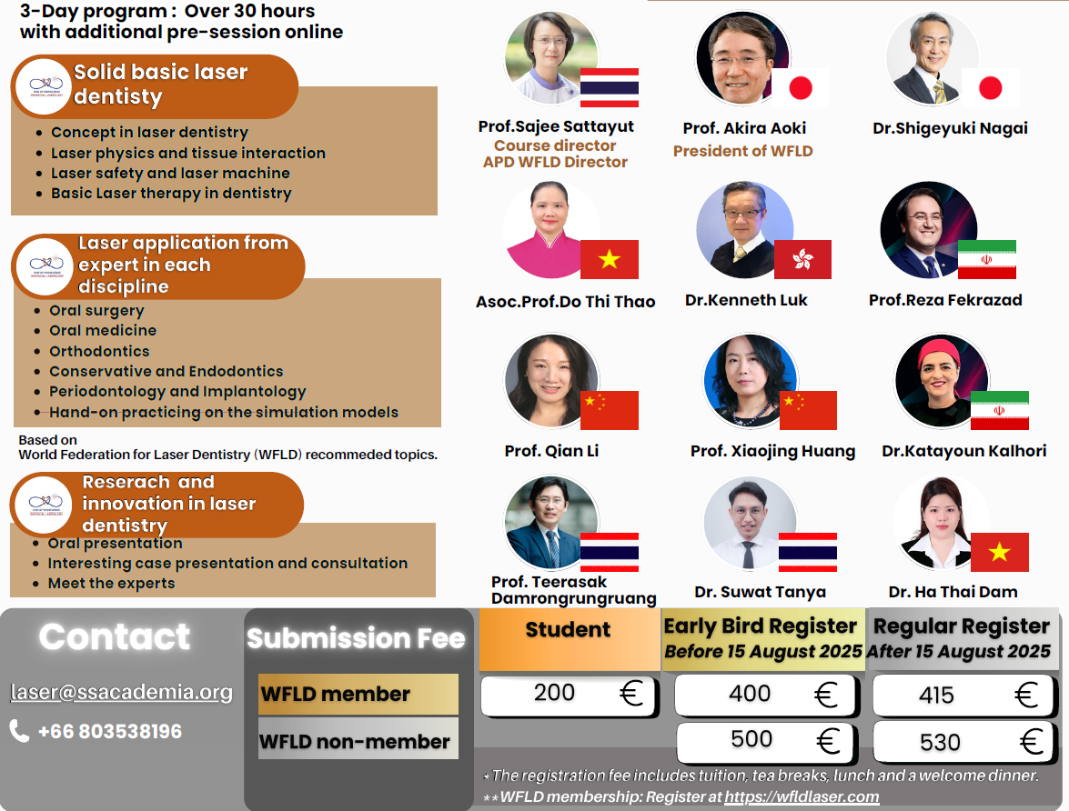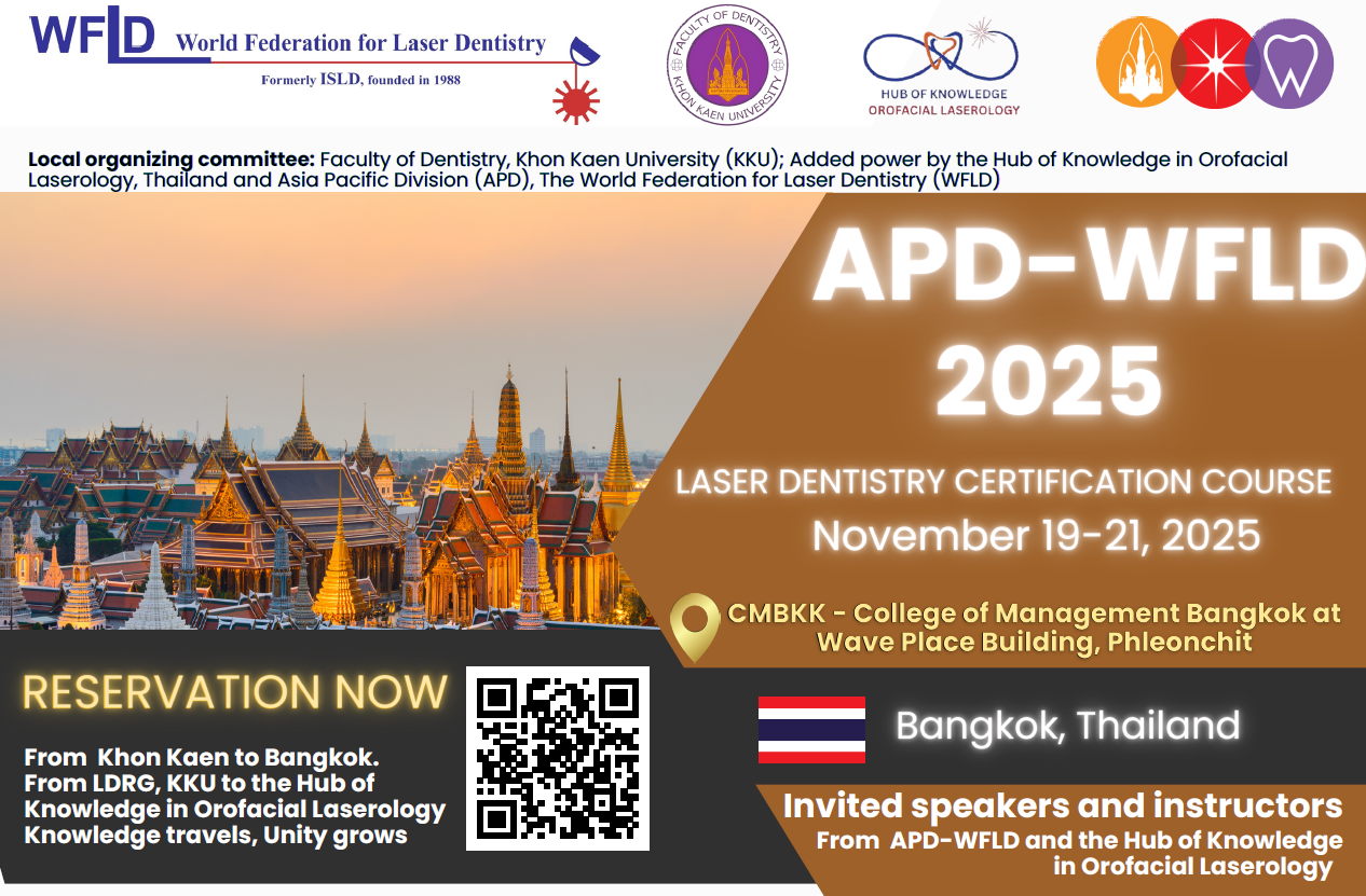 Asia Pacific Division (APD) of the World Federation for Laser Dentistry (WFLD) has been the forerunner in providing evidence-based dental laser education in the Asian Pacific region for more than a decade. The 2021 APD Scientific Conference was held ON-LINE from July 16th -17th 2021. The theme of the Conference was on “New Developments in Dental Laser Applications and Education”. The conference brought together more than 30 international professionals, clinicians, researchers and educators to present new developments in bio-photonic application and education in Dentistry. Check Abstract Book